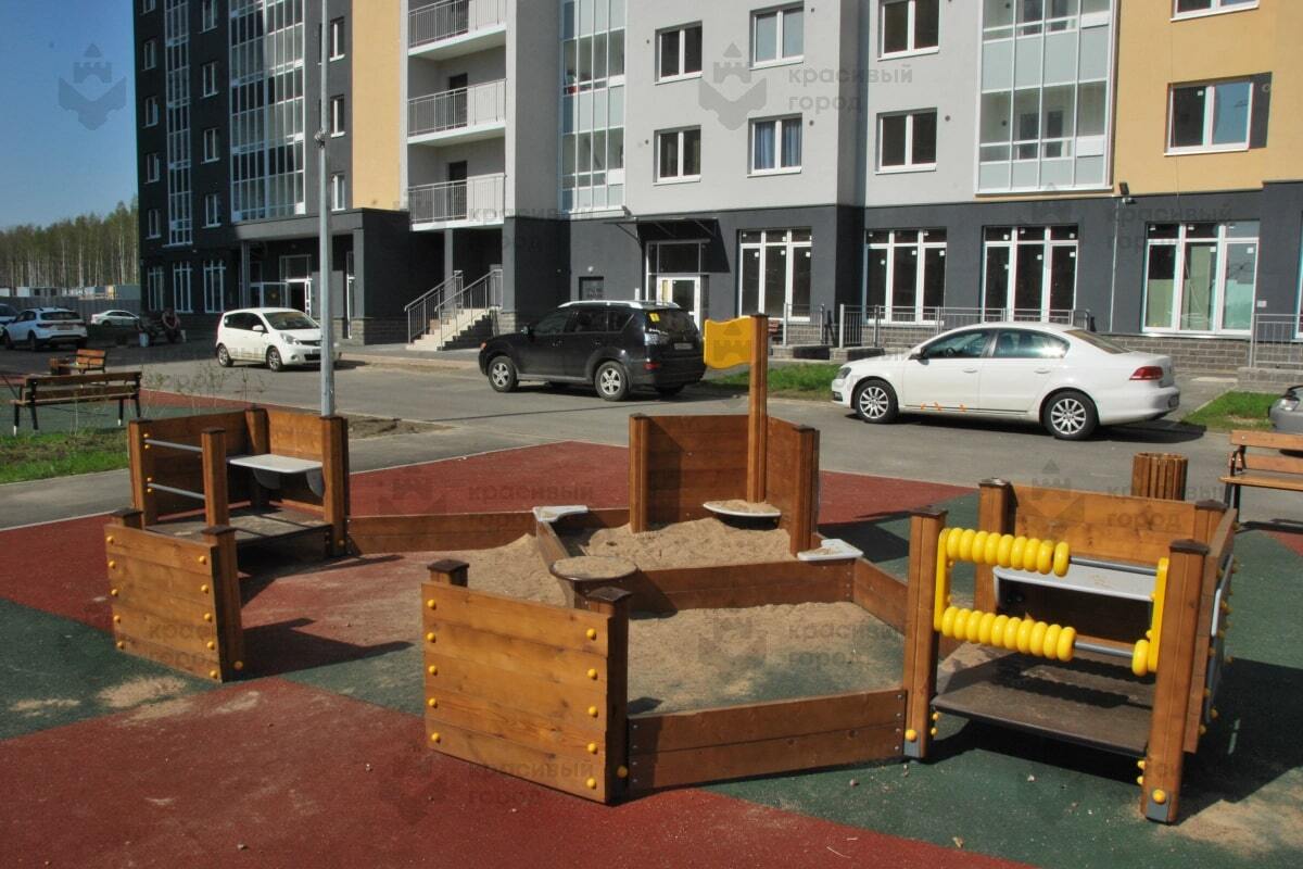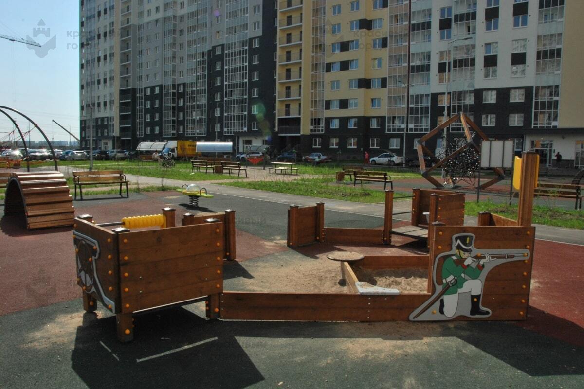 Песочный дворик «Редут» выделяется своим оформлением. Он стилизован под оборонные позиции войск Российской Империи во времена русско-французской войны. Здесь есть принты с пушками и даже изображение готового пойти в атаку гусара.