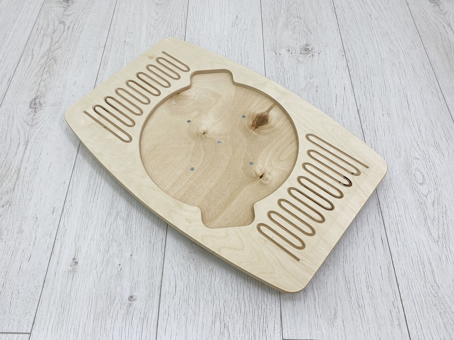 Это игровой тренажёр, улучшающий работу мозга через тренировку всего тела. Состоит из прямоугольной доски, закреплённой на неустойчивом основании в виде полусферы. В зоне ног ребристая змейка и противоскользящее покрытие. В центре балансира углубление под вставку-лабиринт. Её можно заказать отдельно.