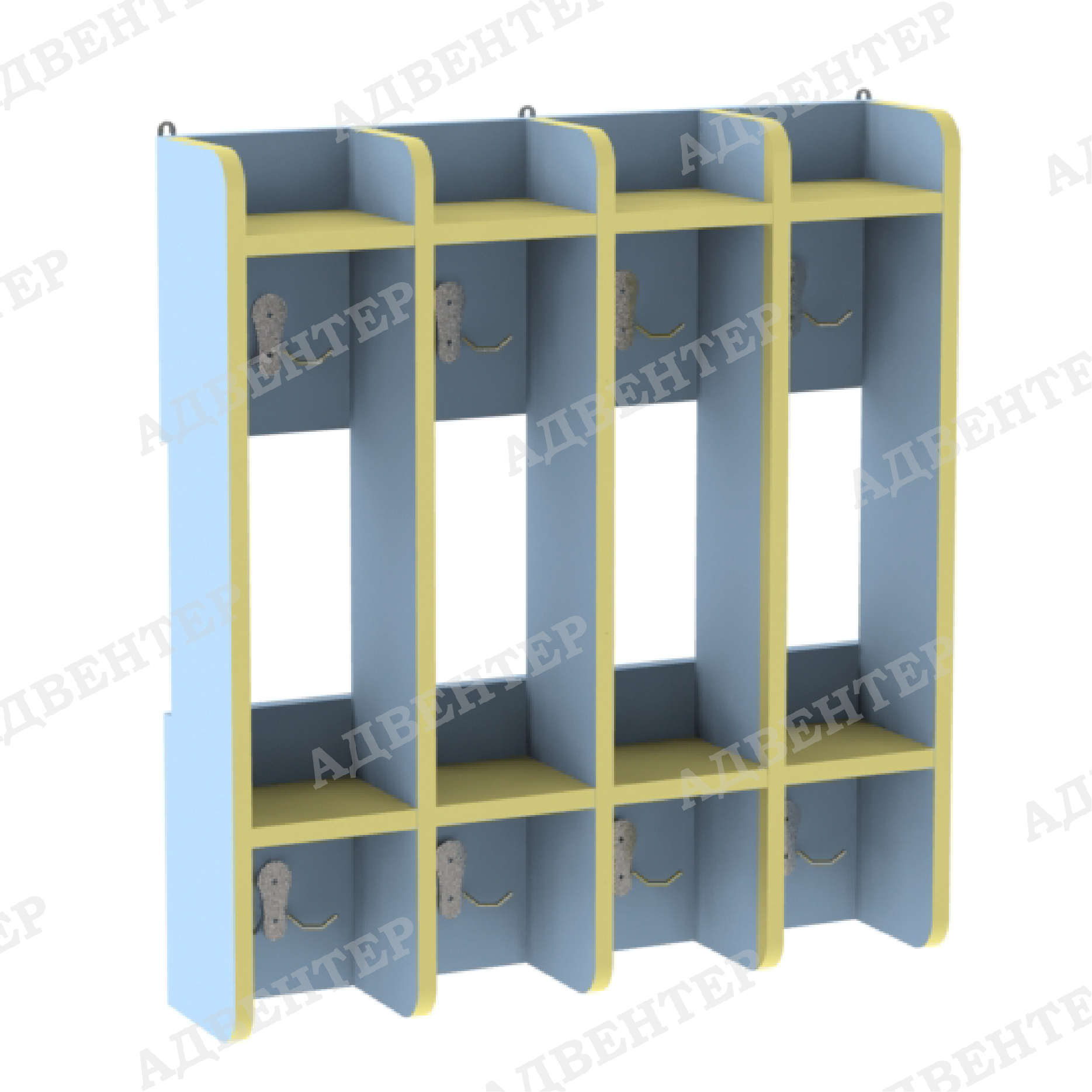 Наша навесная полотенечница имеет размеры 643х140х700 мм и состоит из восьми секций, которые располагаются по две вертикально в одном корпусе. В каждой из секций имеется двухрожковый крючок, на который можно удобно повесить индивидуальные полотенца для детей. Практичный и удобный вариант для туалетной комнаты детского сада.