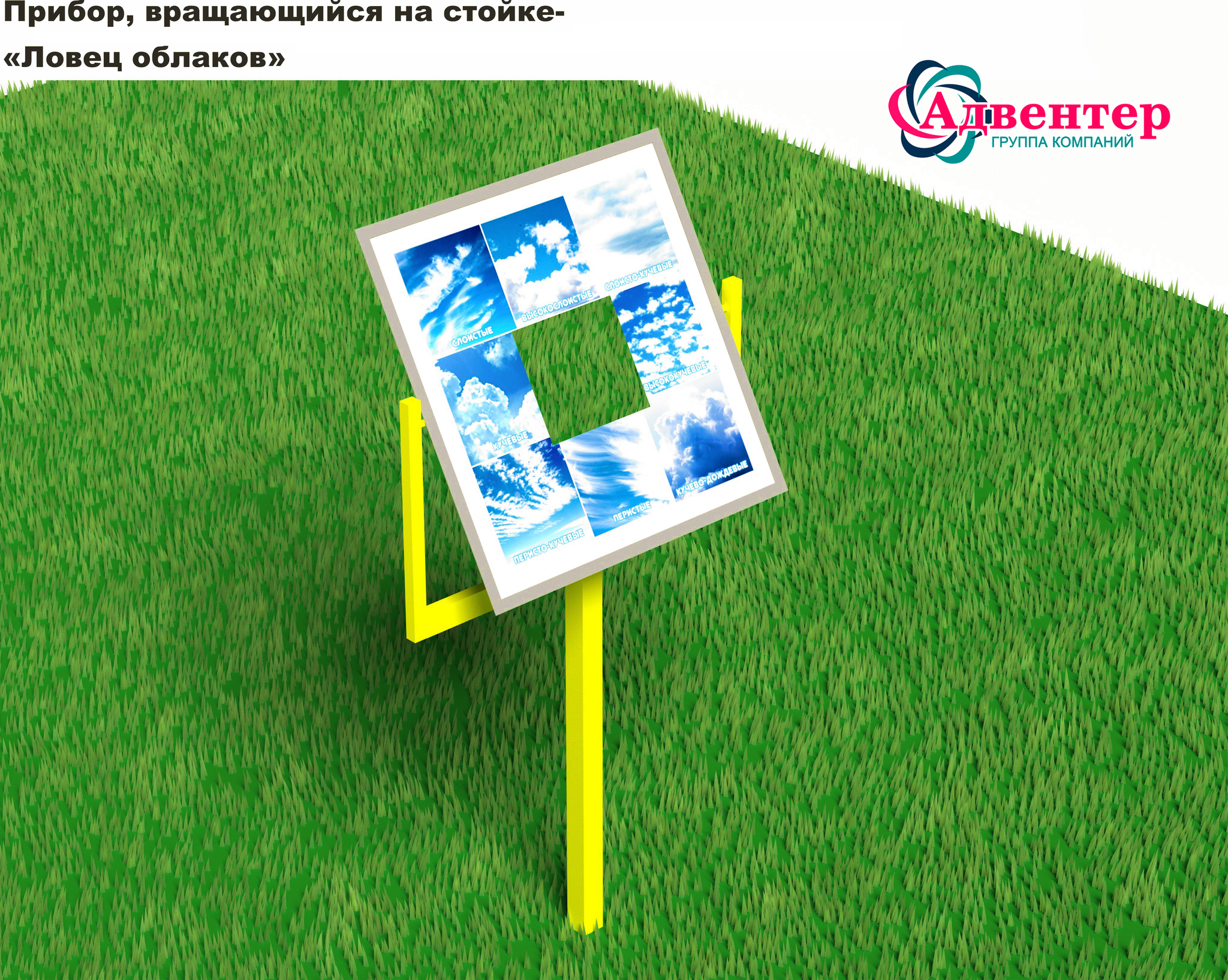 Стенд "Ловец облаков" предназначен для изучения детьми различных видов облаков. Это интересное и увлекательное занятие, искать на небе облака через специальное окошко и сравнивать их с изображениями на стенде, понимать какой прогноз погоды на ближайшее время, будет ли дождь или ясная погода. Оборудование вращается вокруг своей оси, а также его можно наклонять и заниматься изучением облаков.