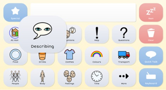 В программе есть обширная библиотека символов для слов и фраз, с помощью которых можно создавать собственные страницы для общения и обучения. Набранные с помощью символов и клавиатуры сообщения озвучиваются синтезированным голосом. В этой программе есть большой выбор готовых страниц, используя которые можно сразу общаться или с возможностью их редактирования под собственные потребности.