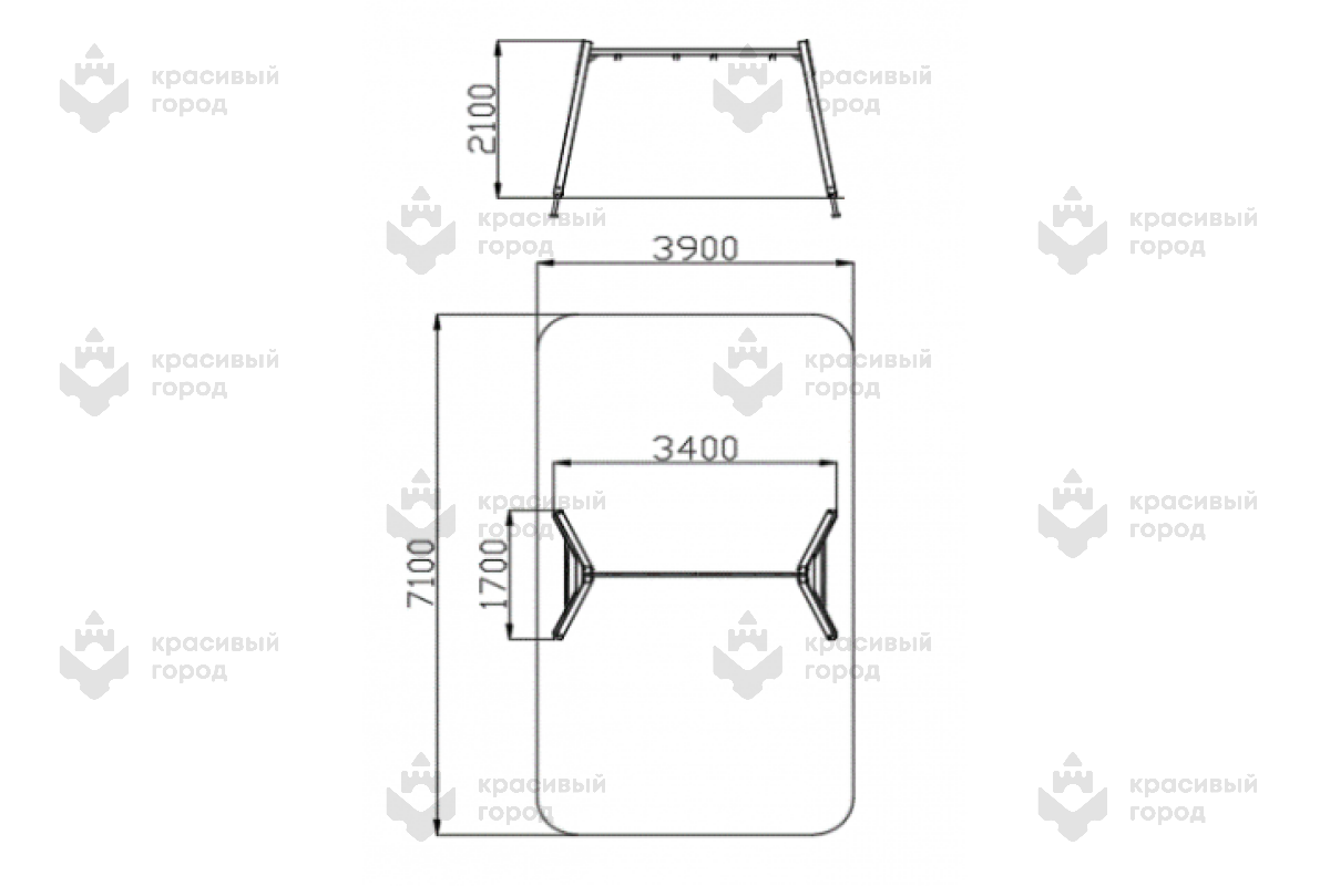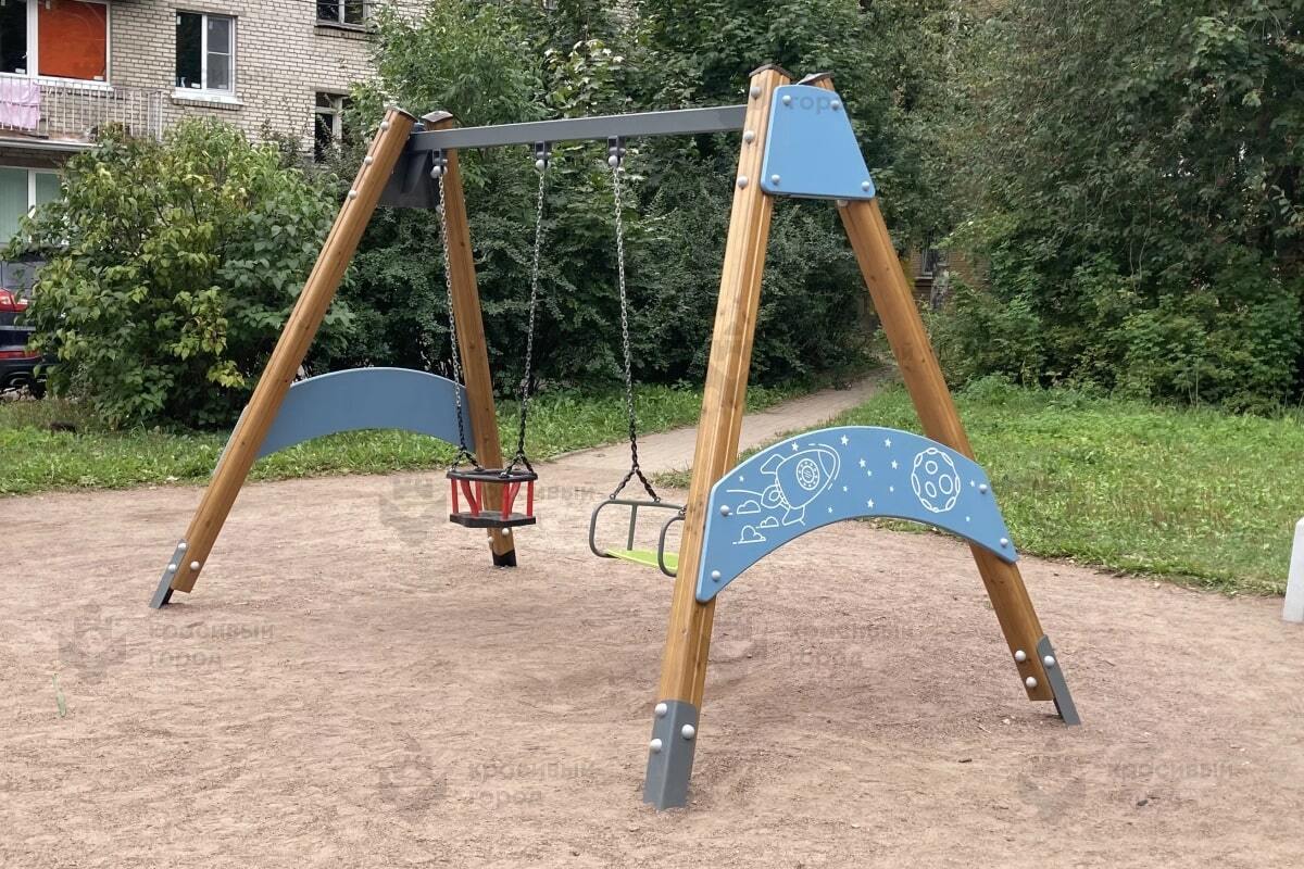 Двойная рама для уличных детских качелей «Космос» выполнена для размещения сразу двух подвесов того типа, который вы посчитаете наиболее удобным.