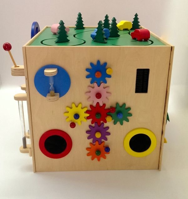 Развивающий кубик представляет собой квадратный модуль размерами 60х60х60 см, выполненный из натурального дерева и покрытый гипоаллергенным лаком. Изделие используется для развития мелкой моторики ребенка, воображения, различных тактильных ощущений и зрительной стимуляции. Кубик имеет пять рабочих граней, на которые нанесены различные тактильные элементы разных форм для нескольких типов игр.