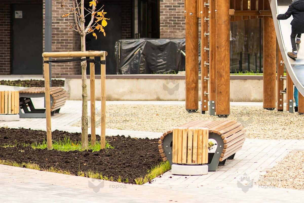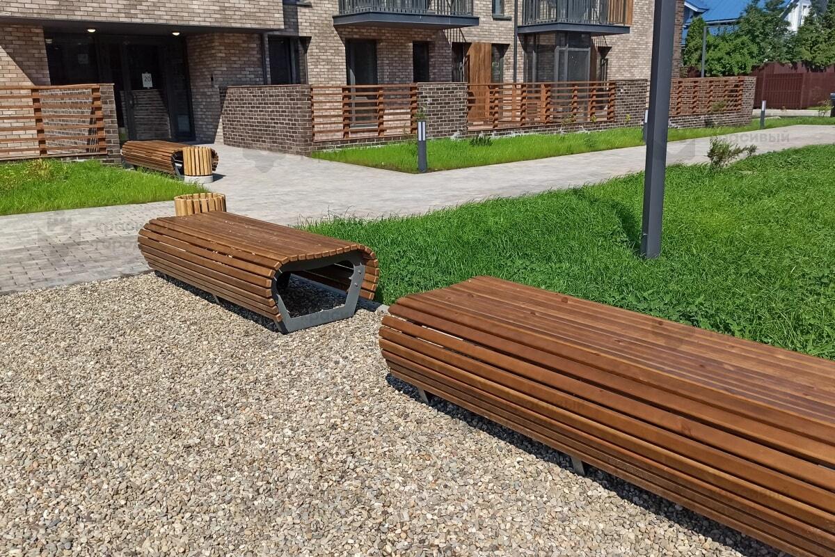 На металлический каркас практически до самой поверхности земли прикреплены деревянные досточки. Также заслуживает внимания и применение натурального дерева для обустройства сидения. Оно отлично сохраняет тепло, делает скамейку удобной в применении вне зависимости от времени года. Такого типа скамейки очень украшают прогулочные дорожки, скверы и дворы.