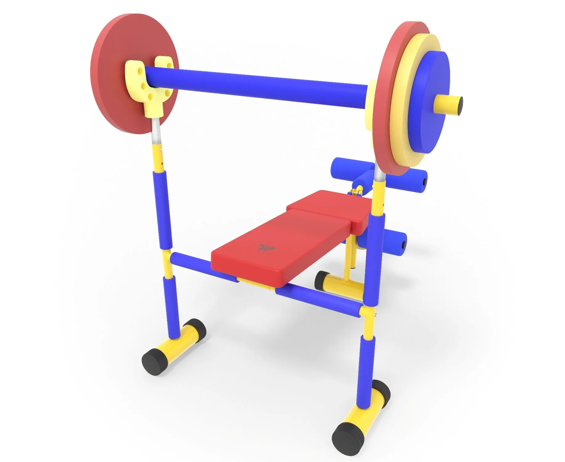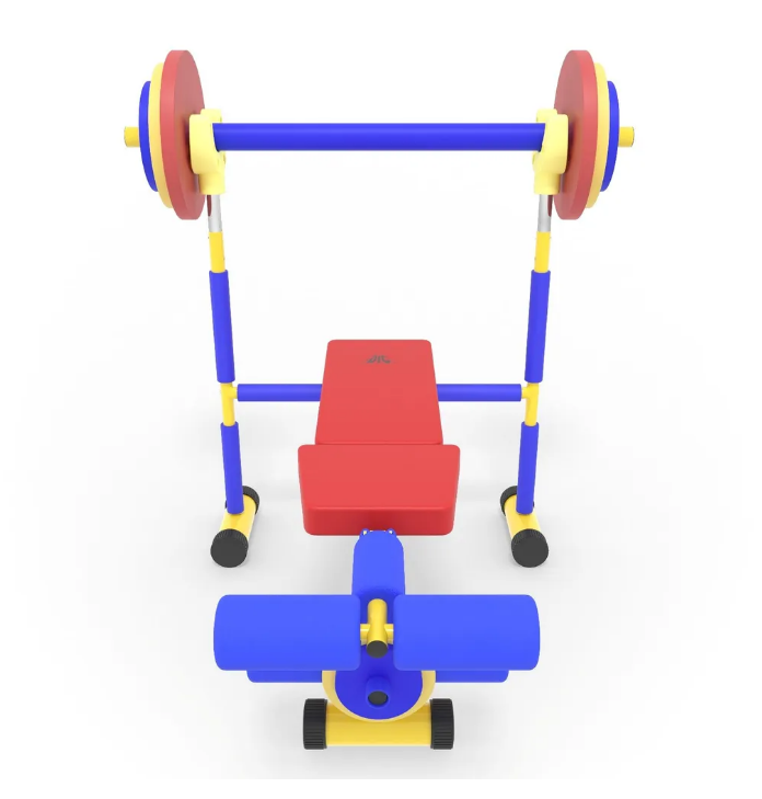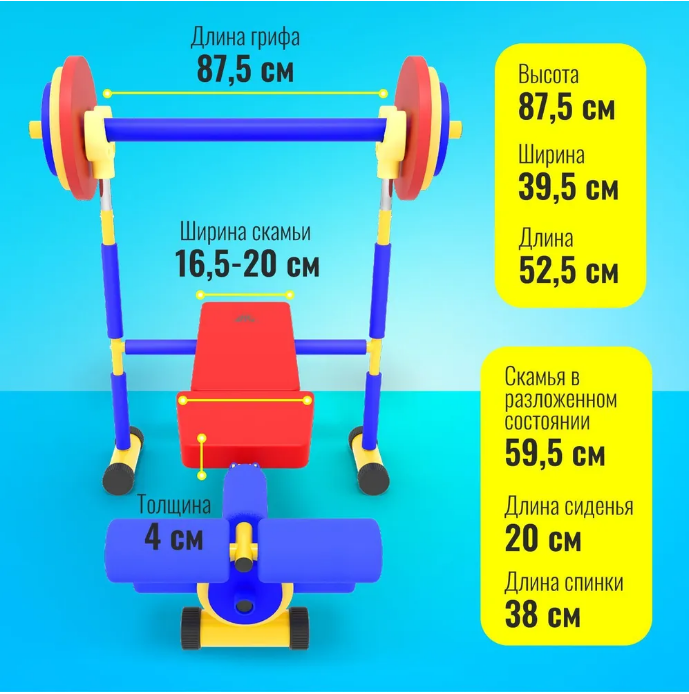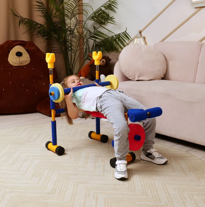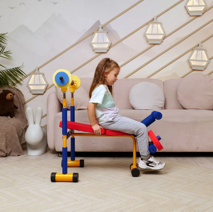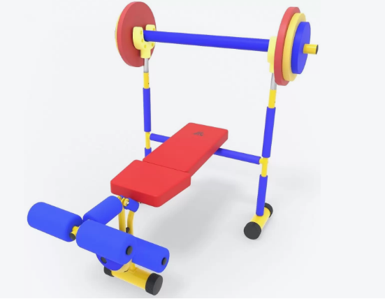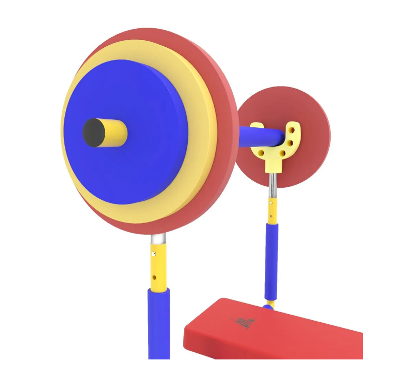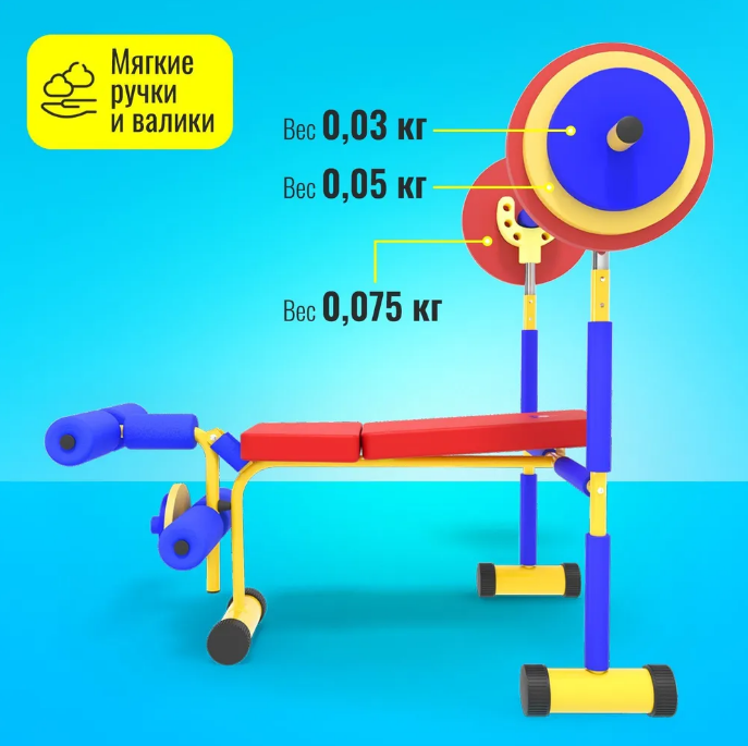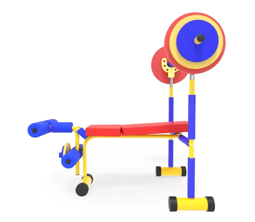 Скамья продается в комплекте со штангой и 8 весовыми пластинами разной массы. Поднятия штанги и жим ногами на специализированной детской скамье укрепляет мышечный корсет и развивает выносливость ребенка.