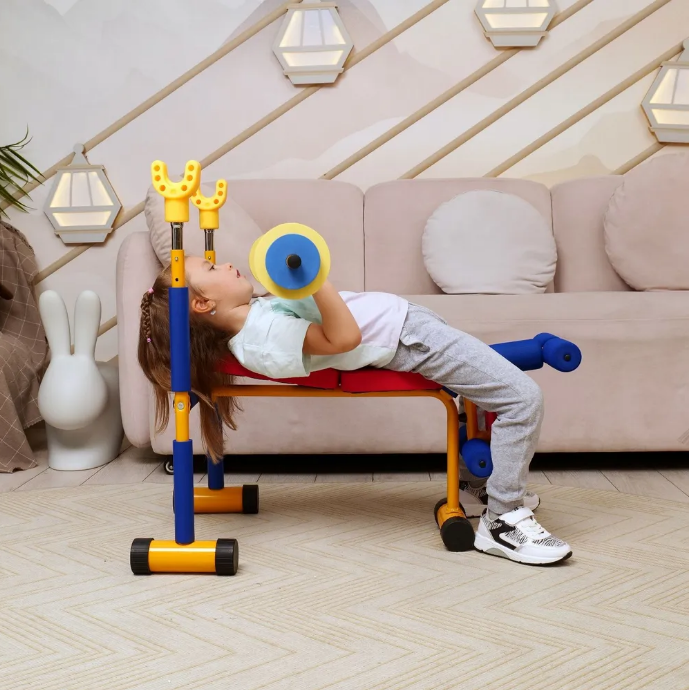 Скамья для домашних детских тренировок с усиленной конструкцией. Скамья легко собирается и транспортируется, а весовые гантели не требуют наполнения водой.