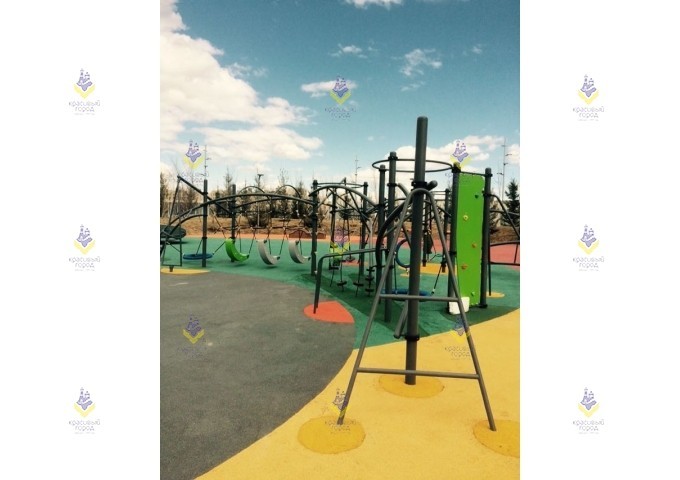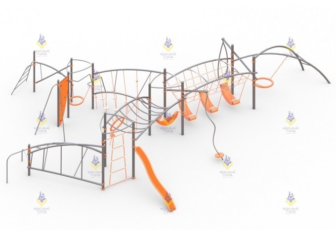Самый крупный спортивный комплекс из серии "Альфа" предназначен для увлекательного и активного отдыха. Это своеобразная многоплановая полоса препятствия, которая развивает координацию, ловкость, логическое и пространственное мышление, реакцию, решительность и целеустремленность. Комплекс можно «проходить» на скорость, перебираясь с одной стороны на другую и цепляясь руками и ногами за наиболее подходящую перекладину, канат или подвес «банан». Комплекс можно проходить на ловкость, перемещаясь без рук или по верхнему уровню перекладин. Здесь есть чем заняться и одному ребёнку, и целым командам. Спортивный комплекс «Альфа» объединяет в себе различные тренажеры: вращающиеся вокруг собственной оси элементы с опорой для ног в виде «блинчика»; рукоходы с различным шагом перекладин под разными углами; кольца в оплётке также могут быть использованы как минимум двумя способами: они являются опорой для ног, если комплекс используется как полоса препятствий и её нужно пройти, не коснувшись земли. Второй способ – упражнение «ныряние» - ребёнок должен шагнуть внутрь кольца, пригнуться и на карачках из-под кольца вылезти; канатный полутоннель предназначен для развития и координации движения; стена-скалодром преодолевается, цепляясь за выступы руками и ногами. Выбирая маршрут, дети учатся принимать решение. Кроме того, на скалодроме укрепляется мышечный корсет плечевого пояса, спины и живота; стена из лиан-канатов и опор для ног в виде «блинчиков» используется для ловкого перемещения над землёй; металлические наклонные лестницы, стойки, вертикальная канатная лестница, а также наклонная поверхность с покрытием из резиновой крошки нужны для подъёма/спуска ребёнка на различных этапах комплекса; многофункциональный подвесной элемент «банан» с выступами зацепами может быть опорой для ног, если комплекс выступает в роли полосы препятствий, а может быть креслом-гамаком.