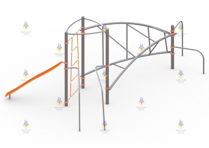 В конструкции предусмотрен весь набор деталей для физической активности. Это параллельные брусья, канатные лестницы, круглый турник и многое другое. Таким образом во время игры ребенок сможет развивать ловкость, гибкость, мышечную силу, равновесие. Большое значение играют и радиусных элементы, располагающиеся под углом – они направлены на улучшение чувства баланса.