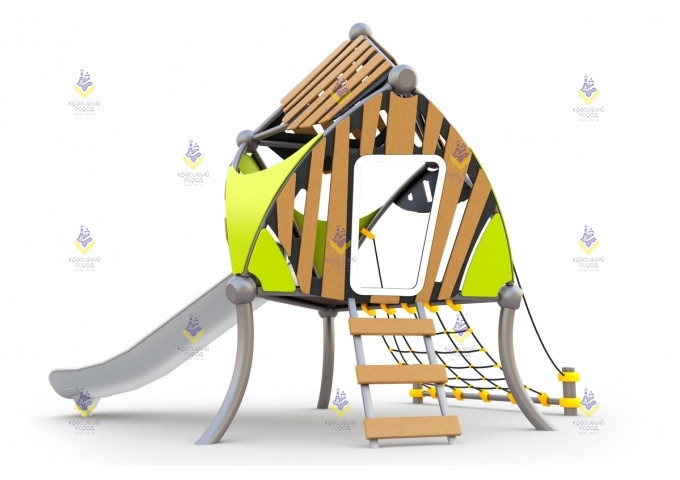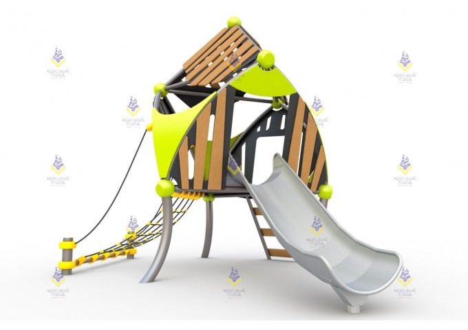 Игровой комплекс «Молекула-3» отличается компактностью и необычным оформлением. Детская площадка включает в себя горку из нержавеющей стали, лестницу, канатную сетку и крытую площадку для игр.