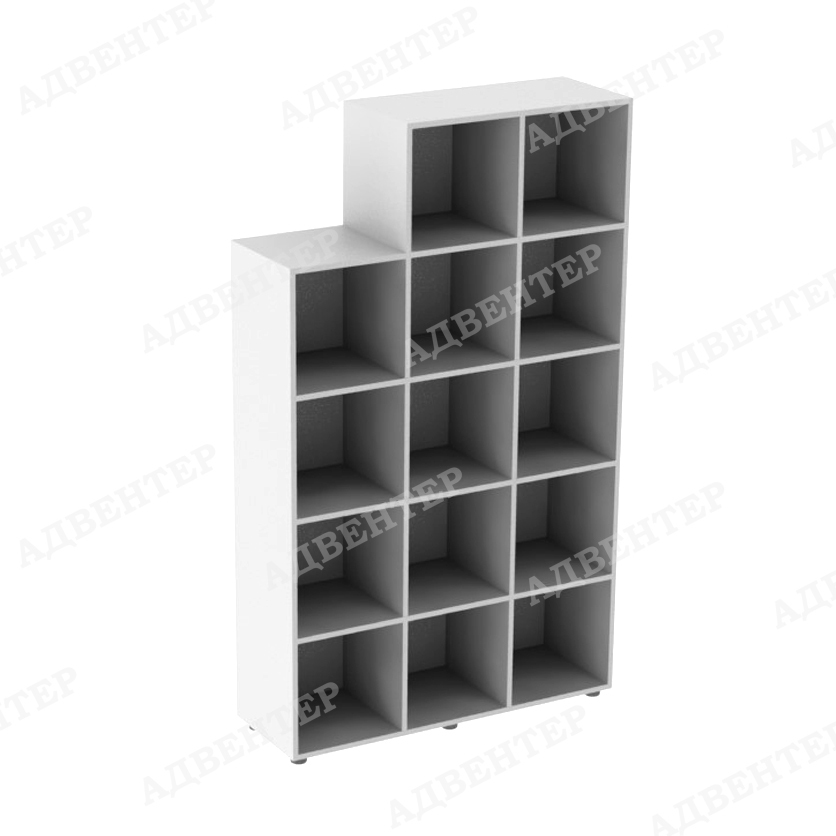 - Оригинальный и открытый стеллаж состоит из двух секций (на 4 ячейки и на 10 ячеек). Секции скрепляются между собой мебельными стяжками.