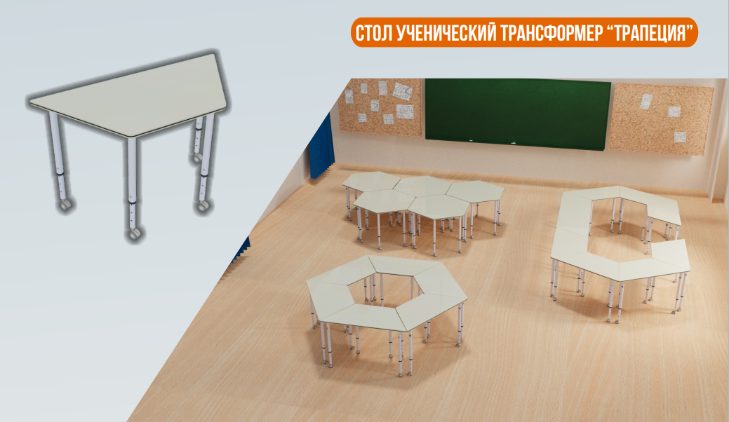 Форма столешницы имеет в своей основе трехстороннюю равнобедренную трапецию с длиной основания 1200 мм. и длинами сторон 600 мм. Комбинация двух столов образует равносторонний шестиугольник с длиной стороны 600мм. Комбинация трех столов образует правильный (равносторонний) треугольник с длиной стороны 1200 мм. Комбинация 6 столов образует правильный шестиугольник со стороной 1200 мм. Кроме указанных вариантов, форма стола позволяет формировать произвольные комбинации.