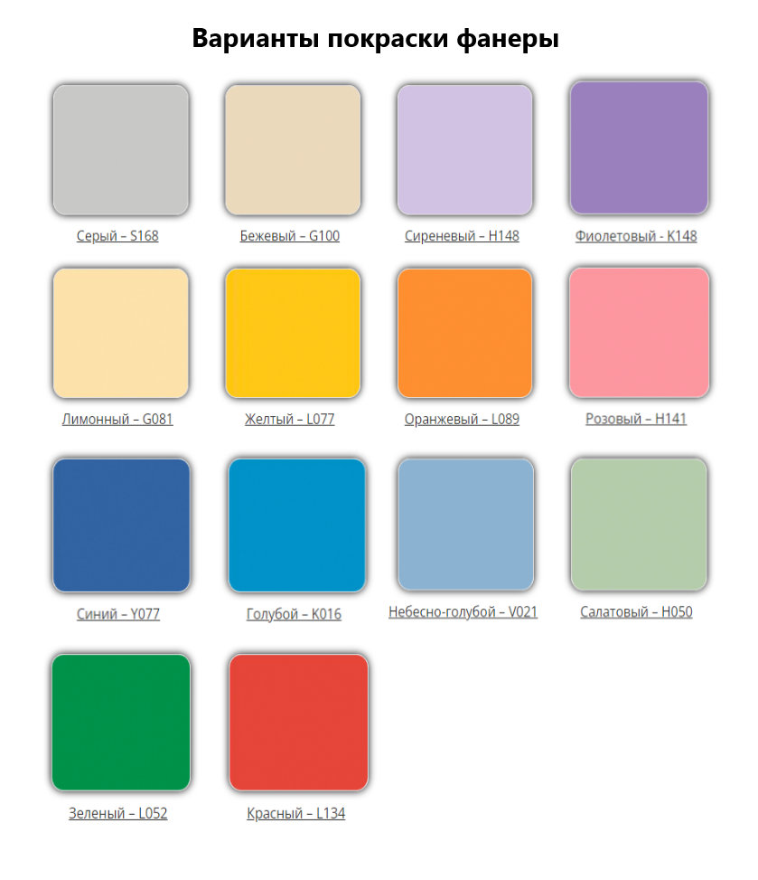 • Цвет можно выбрать по каталогу расцветок краски для фанеры на фото (уточнять при заказе!)