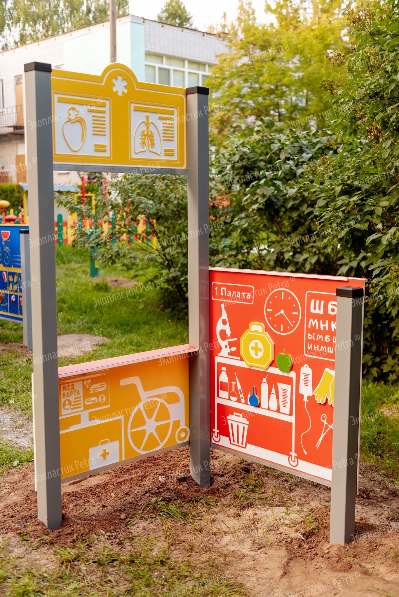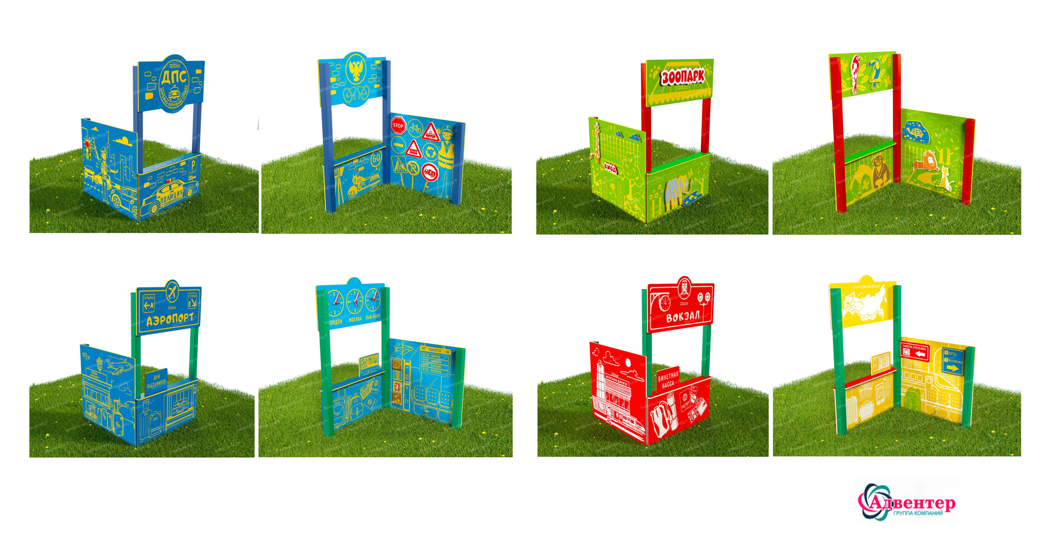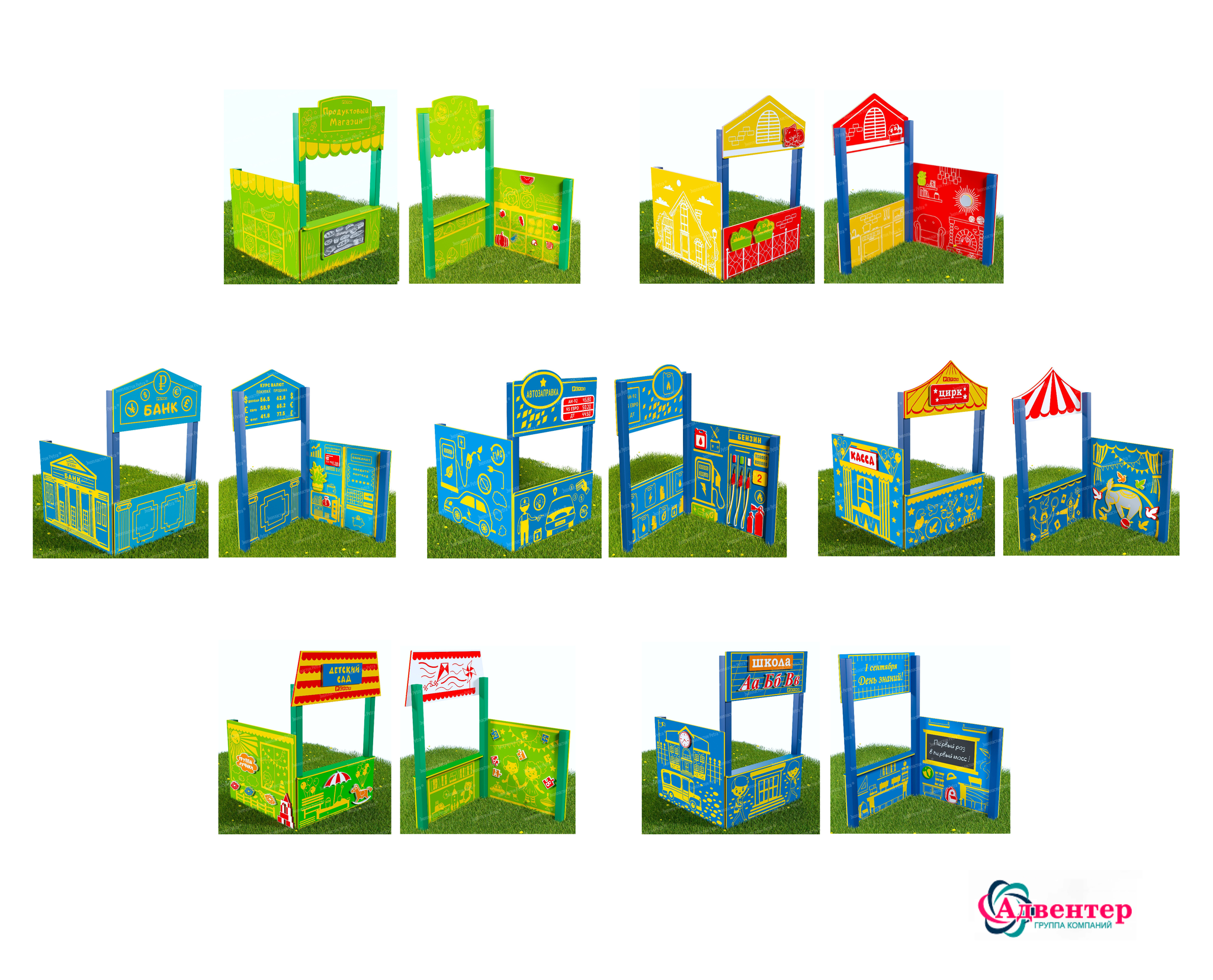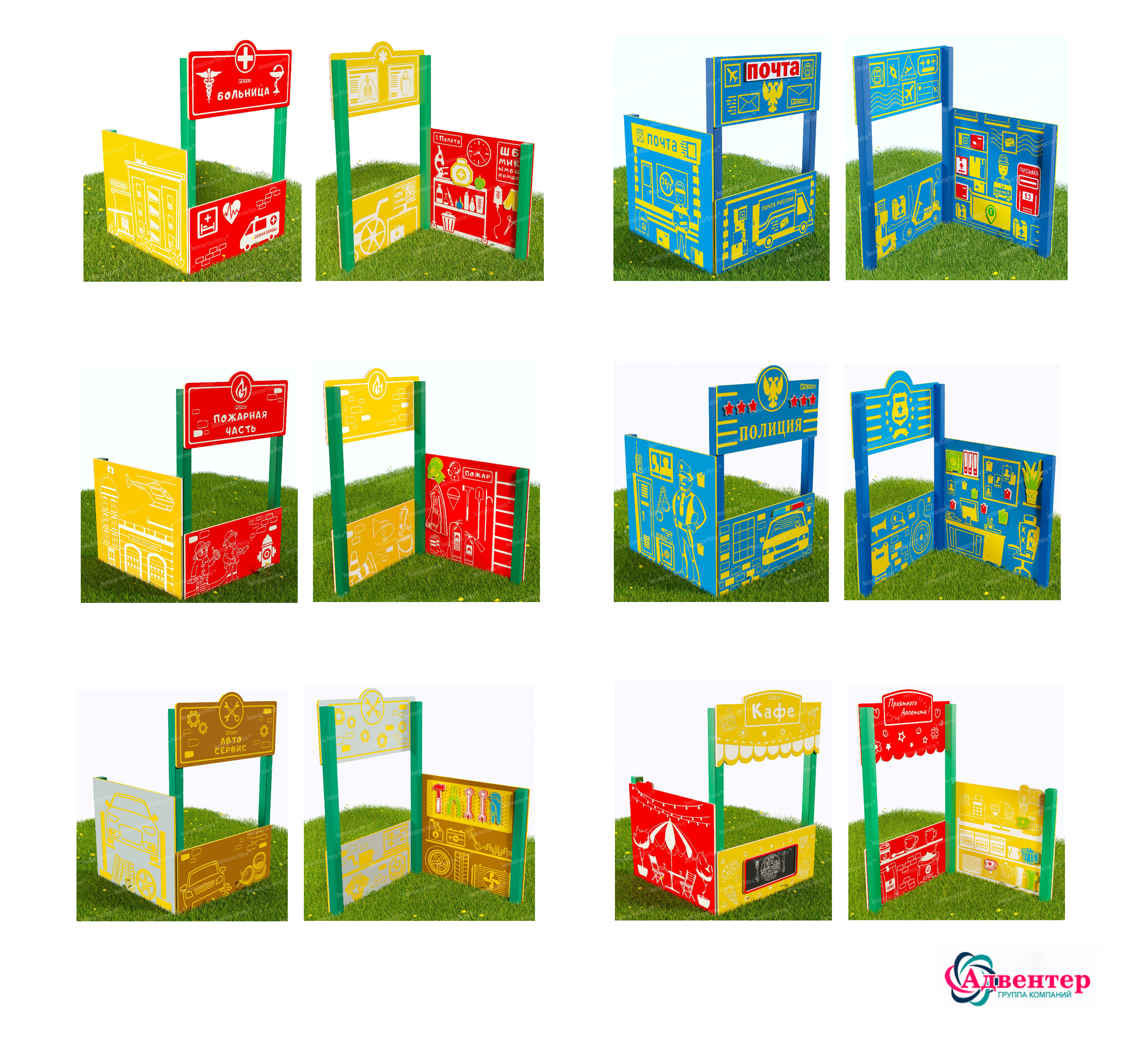 Каждая модель представляет собой угловой модуль, в котором одна стена – окно с вывеской, другая стена – игровая. На игровой стене изображены тематические предметы. Например, в больнице – это стол с медицинскими приборами. Эти предметы либо нарисованы методом гравировки, либо представляют собой объёмные фигуры. Прикосновения к вырезанным на поверхности рисункам и отдельным деталям полезны для детских пальчиков! Это развивает сенсомоторику.