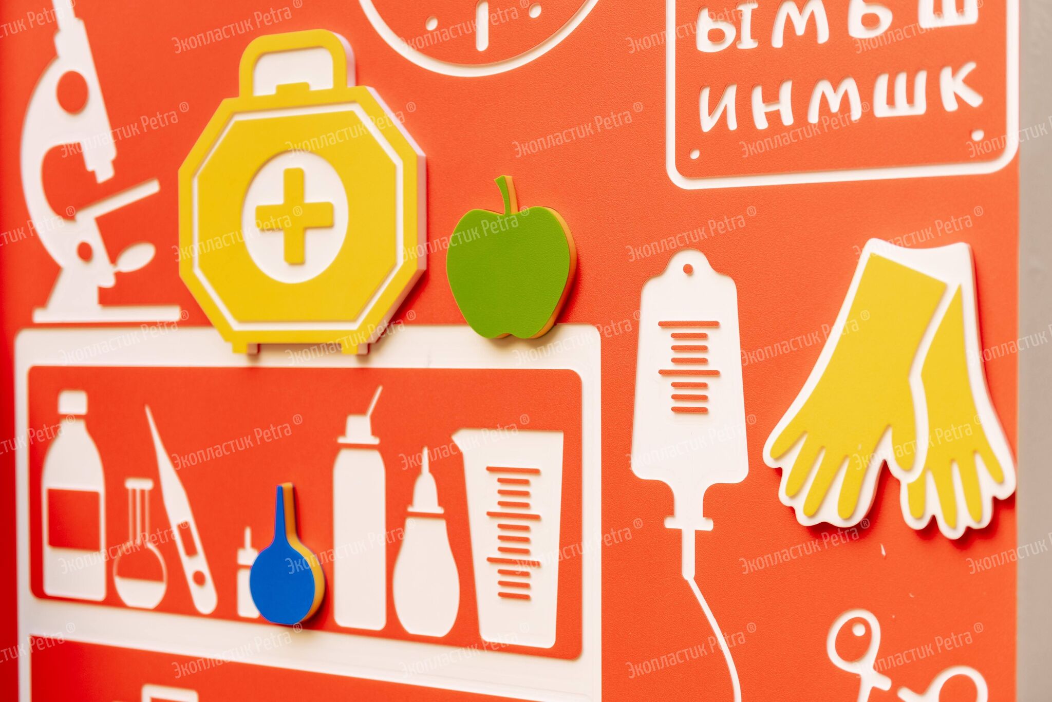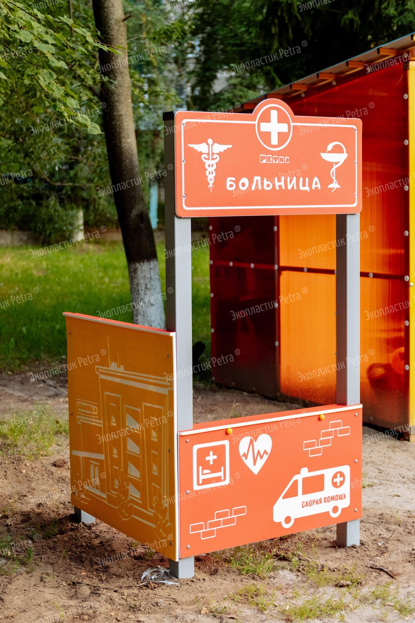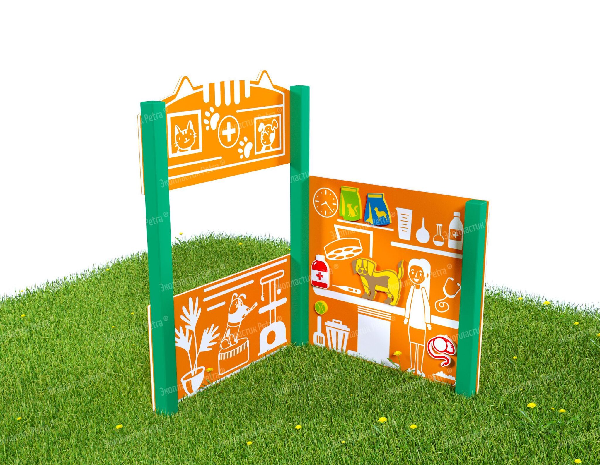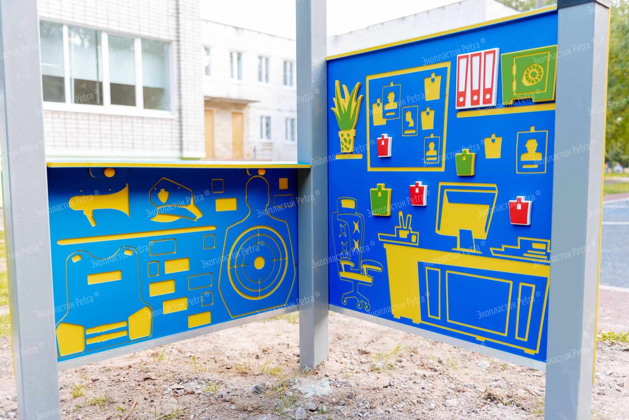 Каждая модель представляет собой угловой модуль, в котором одна стена – окно с вывеской, другая стена – игровая. На игровой стене изображены тематические предметы. Например, в больнице – это стол с медицинскими приборами. Эти предметы либо нарисованы методом гравировки, либо представляют собой объёмные фигуры. Прикосновения к вырезанным на поверхности рисункам и отдельным деталям полезны для детских пальчиков! Это развивает сенсомоторику.