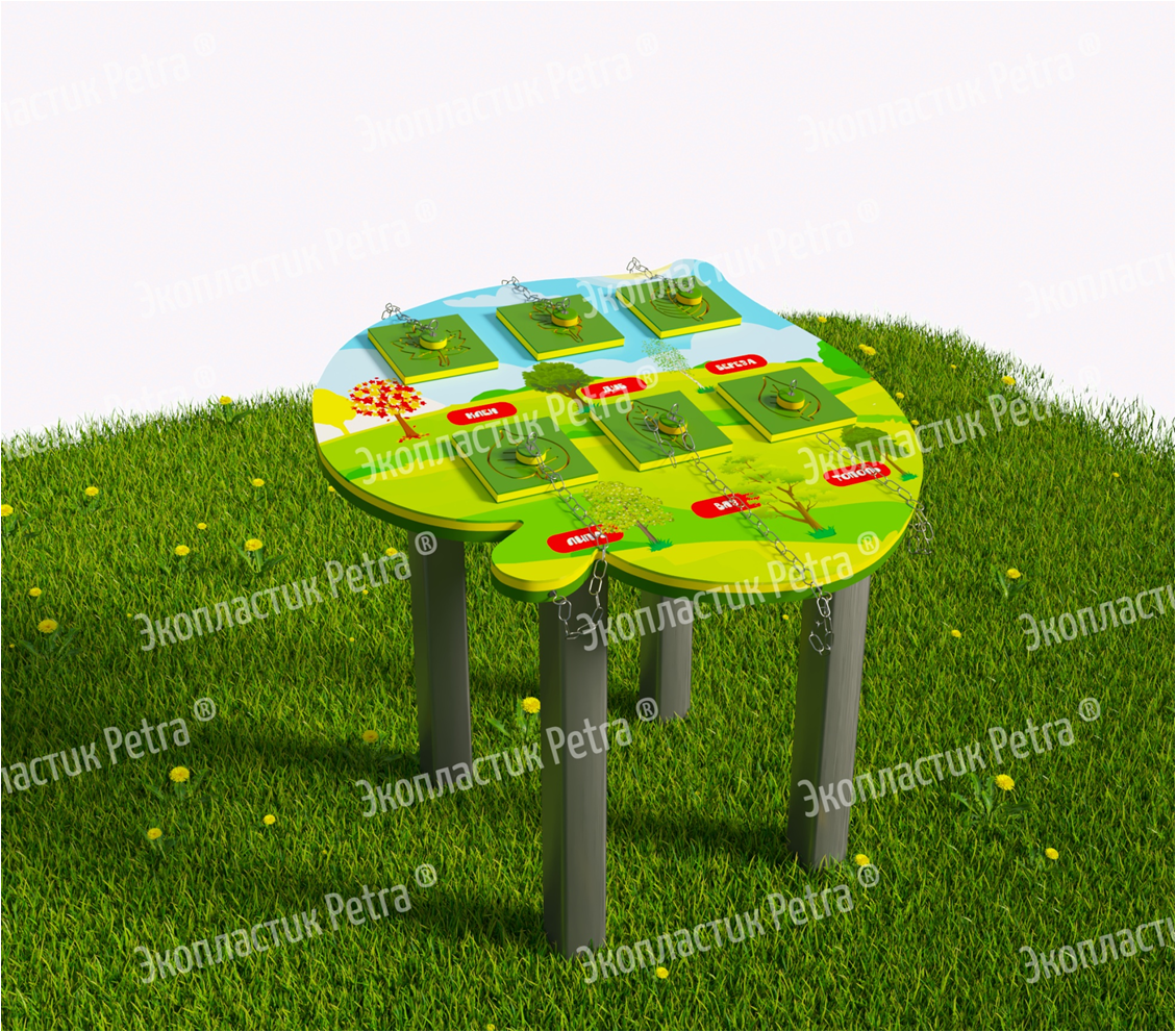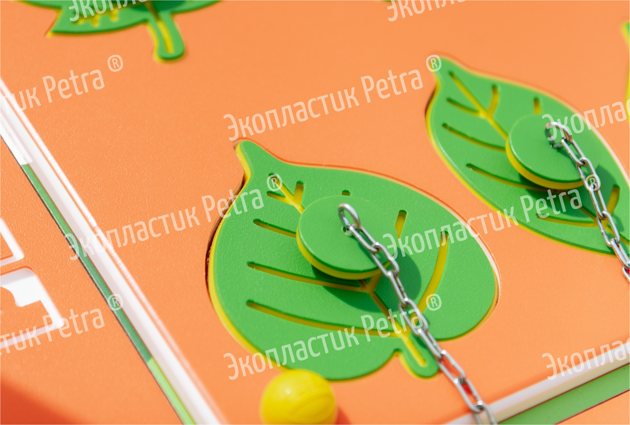 На данном стенде представлены выемки в виде листьев шести деревьев: клёна, дуба, берёзы, липы, вяза и тополя. Рядом есть объёмные фигуры на цепочках в виде листьев, которые нужно в выемки вставить, и изображены сами деревья. Задача – соотнести деревья с их листьями.