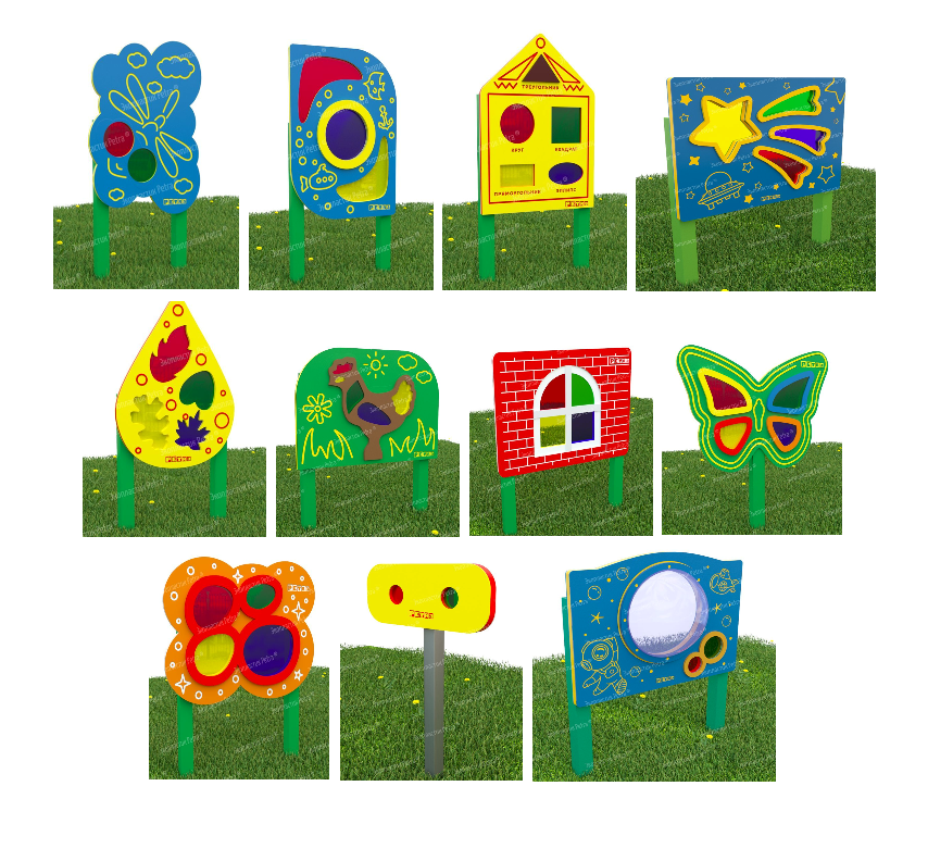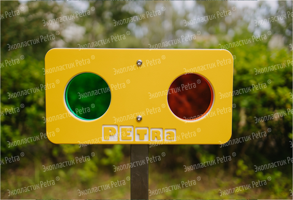 Оптические вставки выполнены из безопасного атмосферостойкого оргстекла разных цветов (жёлтого, красного, зелёного, синего и других). Они защищены надёжными конструкциями и прочно встроены в стенды. Это полностью исключает возможность детского травматизма.