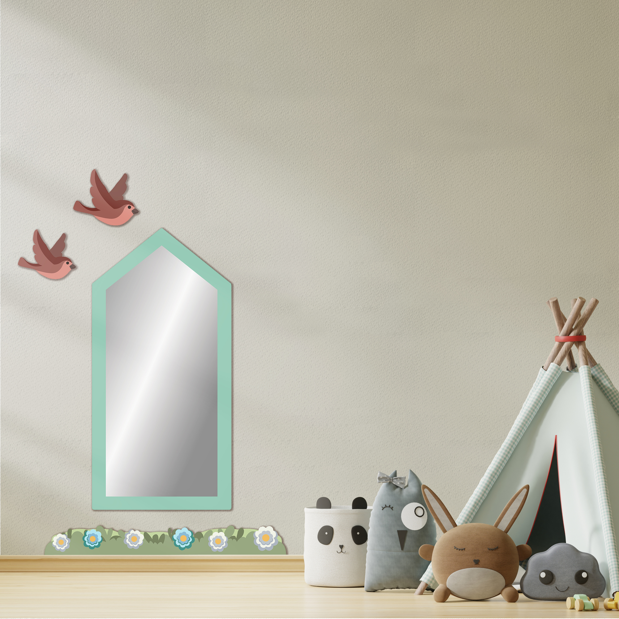2. Зеркало-домик Скандик бирюзовое с птичками и цветами с ростомером: